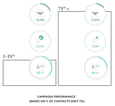 Campaigns sent to a narrow slice of a store’s contacts outperformed campaigns sent to most of the list, providing better open rates, click-through rates, and revenue per recipient: