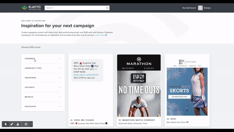 The Klaviyo Showcase features every email or SMS message with context behind why it was successful—so you’ll see concrete examples of what’s been effective in the past and get a sense of how you can translate those messages into content for your own customers.
