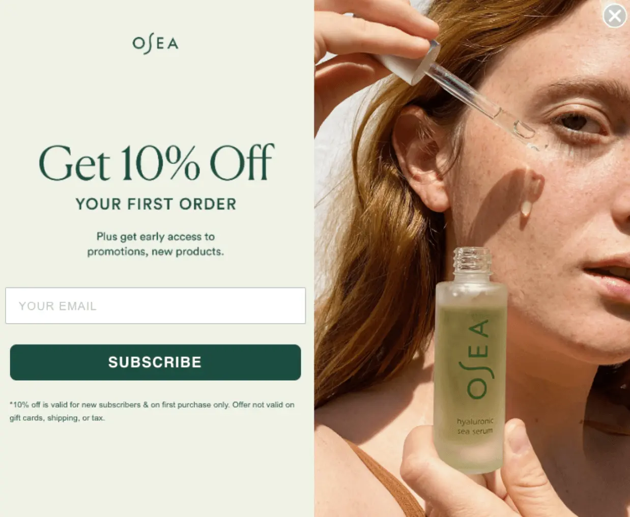 Your standard window pop-up design will depend on how prominent you’d like your pop-up to be, so make sure to define your goal before making any design decisions. This example from OSEA demonstrates what you can do with an eye-catching product image on a standard window pop-up.