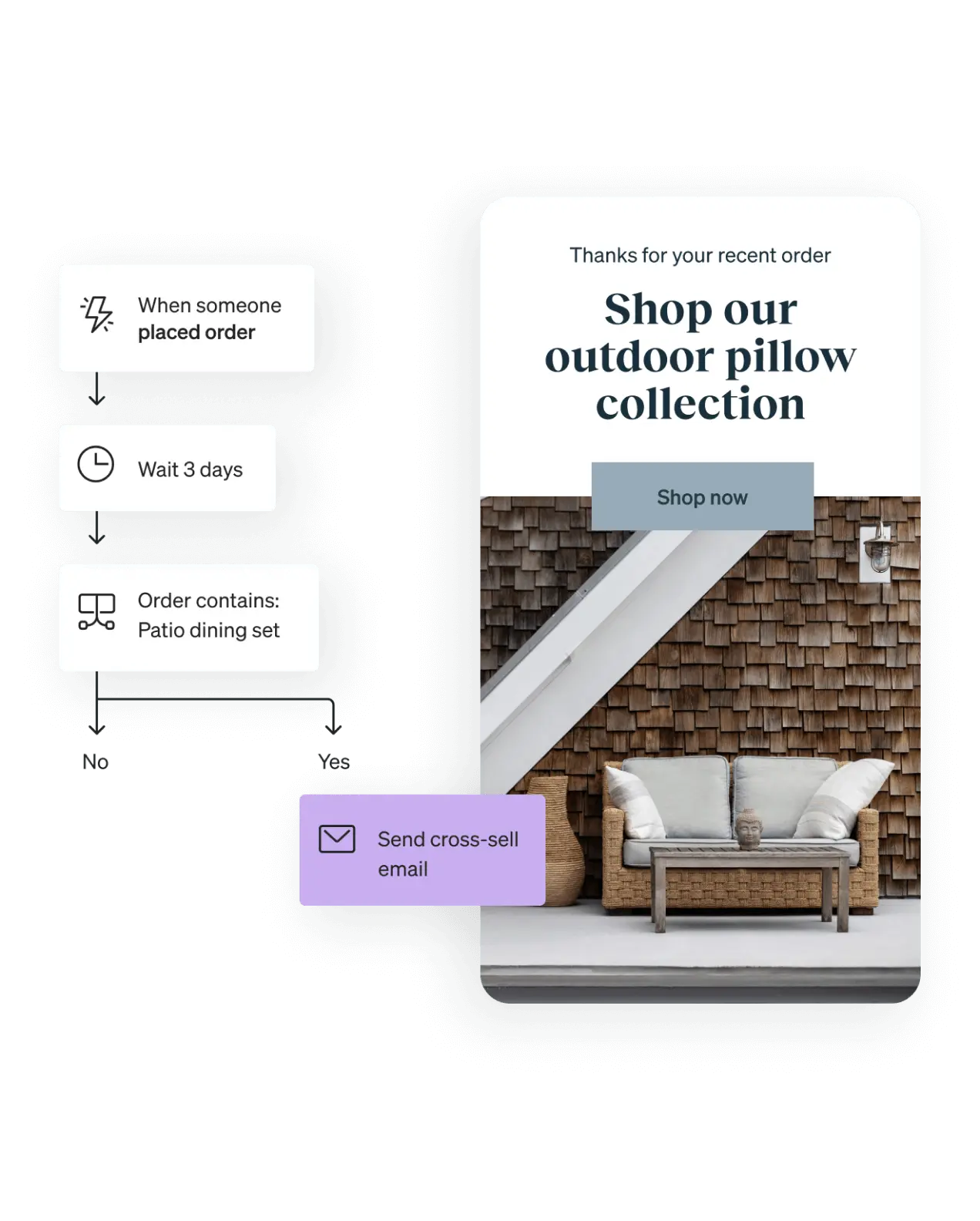 Shopify-specific ecommerce templates are built in. Need something specific? Build custom automations with any number of conditions, splits, emails, and texts.