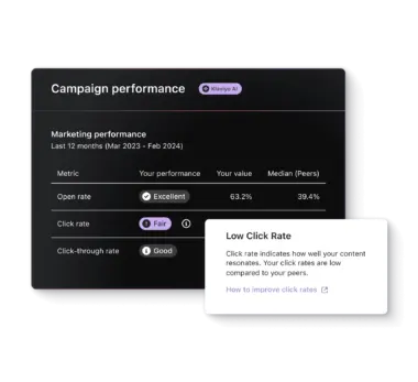 Reach your goals faster by focusing on the metrics that need the most work. Klaviyo’s personalised benchmarks show how your performance compares to similar businesses, so you can see where you’re leading the pack—and where you might be falling short.