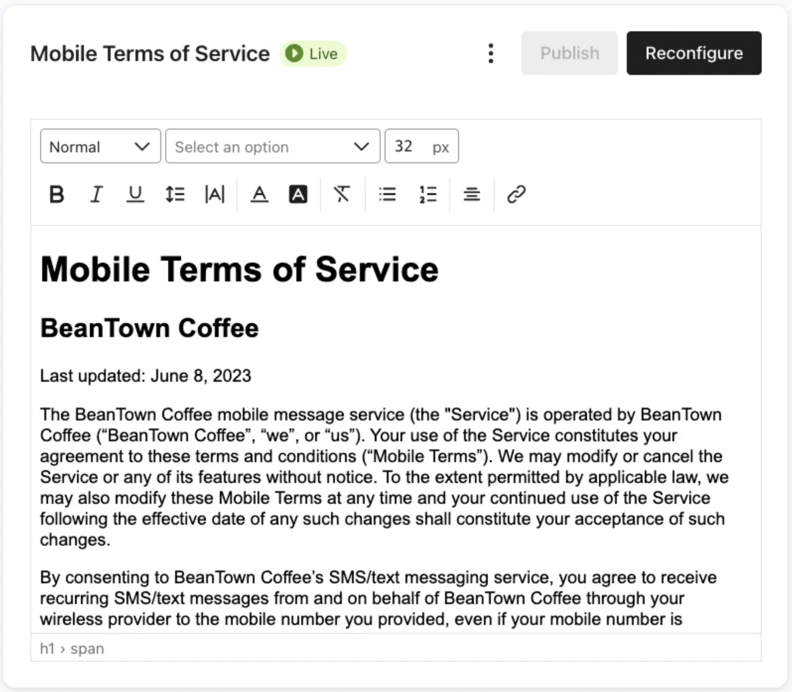 Your mobile TOS doesn’t need to be part of your normal TOS; it can be separate. What’s important is that you link to your mobile TOS anywhere you collect SMS consent, such as sign-up forms and at checkout. Learn how to create mobile terms of service in Klaviyo.