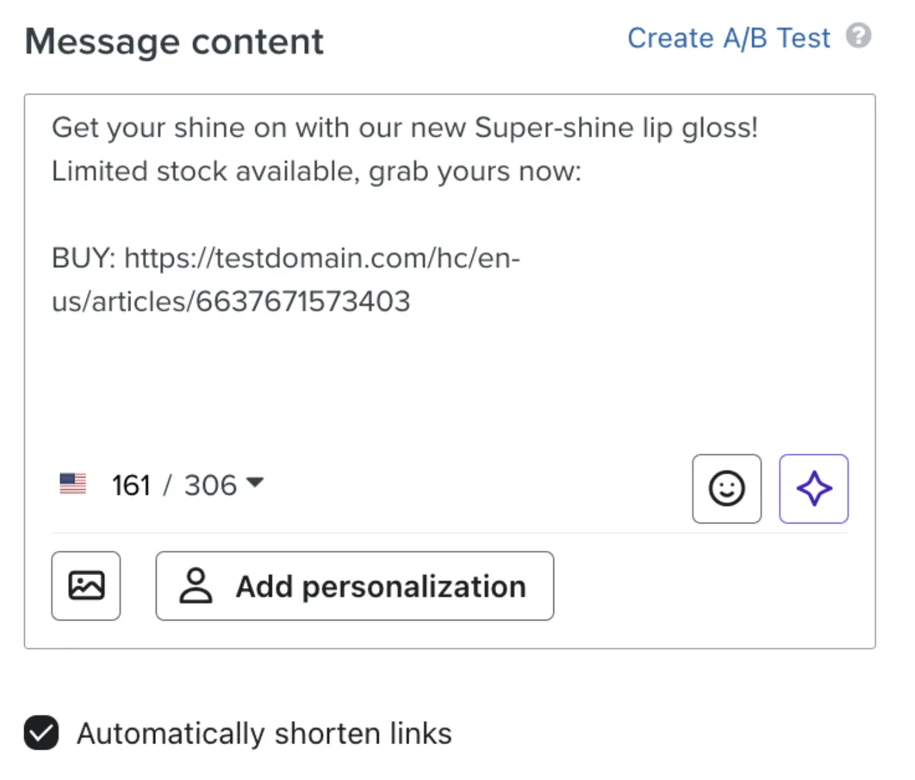 When you start creating SMS messages, Klaviyo automatically shortens links for you by default. Leave the Automatically shorten links box checked. This allows your link to be tracked in Klaviyo, and therefore allows Klaviyo to attribute revenue to the message. If you don’t use a Klaviyo shortened link for tracking, no revenue will be attributed to your message.