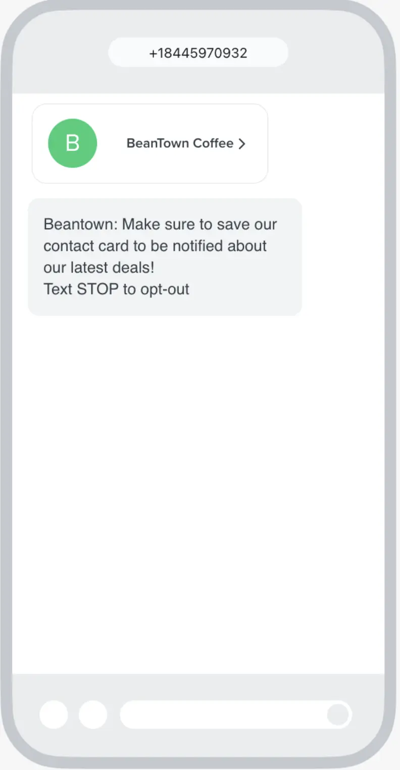 Virtual contact cards build trust with SMS recipients and can reduce unsubscribe rates by 3x. Build your virtual contact card under Settings > SMS. Note that virtual contact cards are sent as MMS messages, which means they will only be delivered through number types that support MMS.