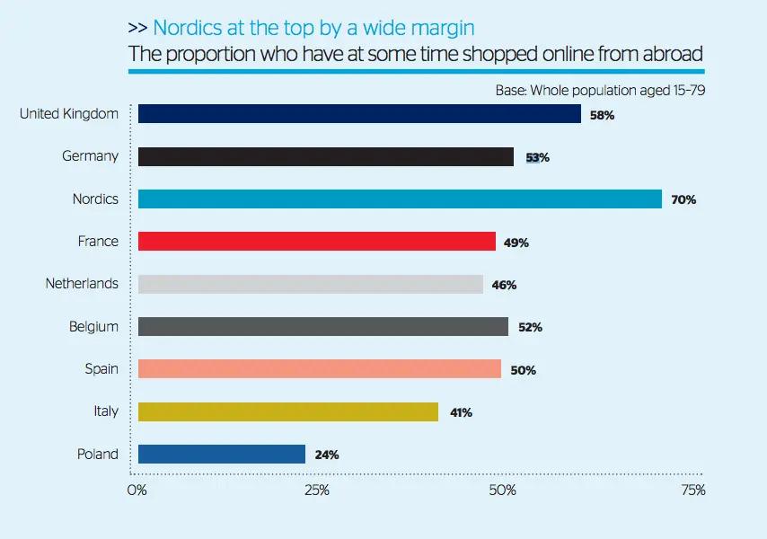 53% of German Internet users bought a product from a foreign country in 2015, which is actually quite high when compared with other European countries (except the Nordics, who don’t give buying a product from a foreign country a second thought).