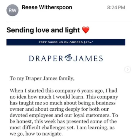 Email from Reese Witherspoon on behalf of Draper James featuring a note addressing the pandemic and introducing a new apparel collection.