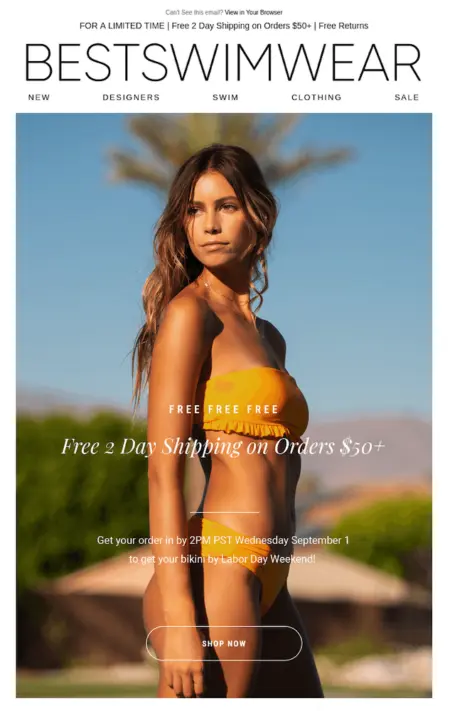 Best Swimwear swoops in to help with the last gasps of summer by promising people they will get their swimsuits before Labor Day weekend. They sent this email the Tuesday before Labor Day with the subject line “Free 2 Day Shipping on Orders $50+.”