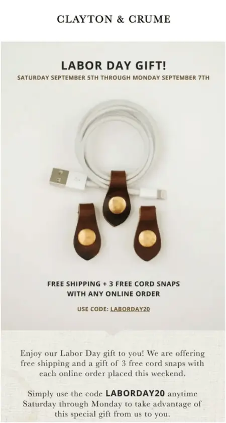 In this Labor Day marketing email, leather goods brand Clayton & Crume offers to waive shipping and include 3 free products with every order. This special promotion removes potential buying obstacles (ahem, costly shipping fees) and helps buyers learn more about the quality of their materials.