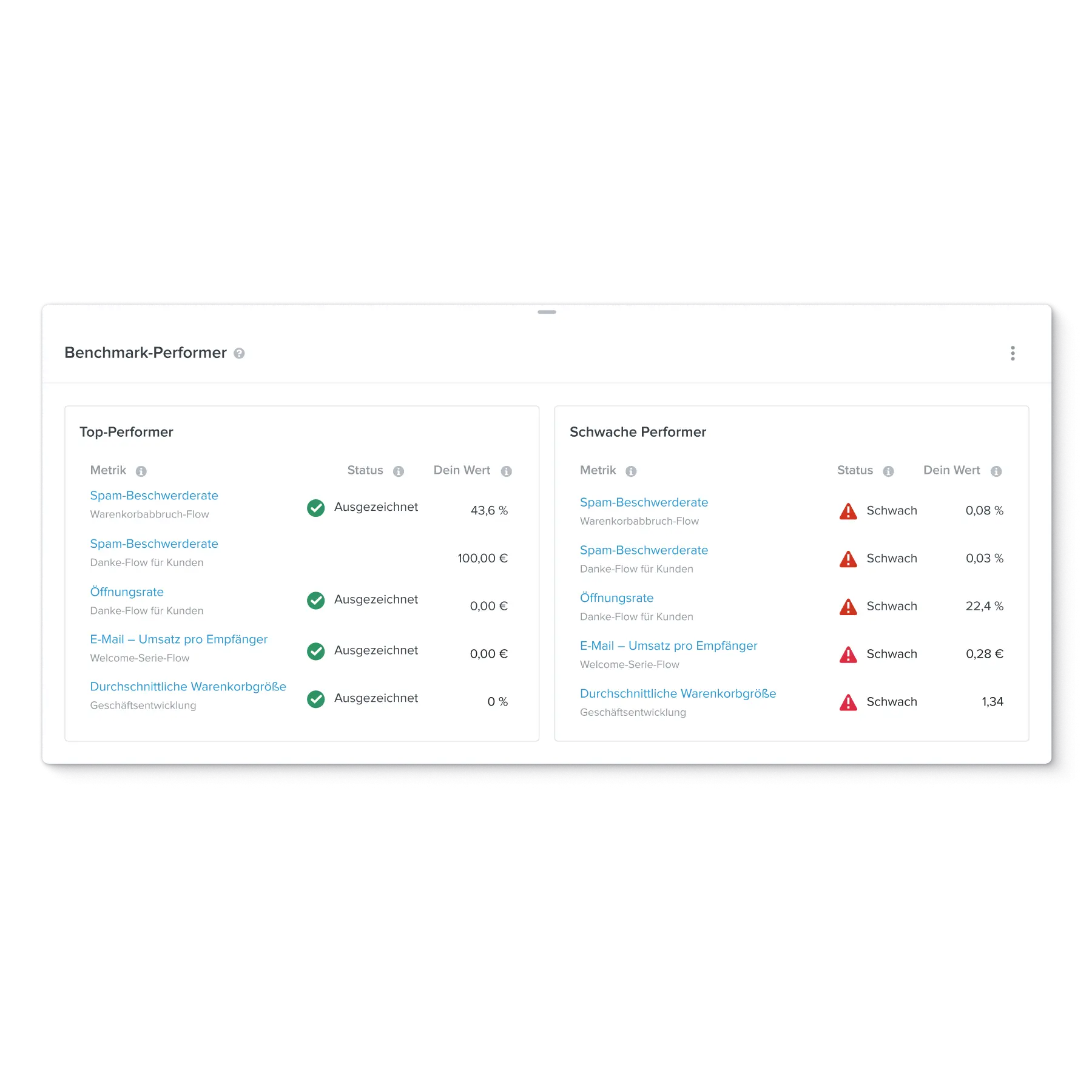 Die KI-gestützten Benchmarks von Klaviyo vergleichen deine Performance mit der von Branchenmitbewerbern. Dafür werden verschiedene Schlüsselmetriken analysiert, von der Öffnungsrate bis zur Conversion-Rate.
