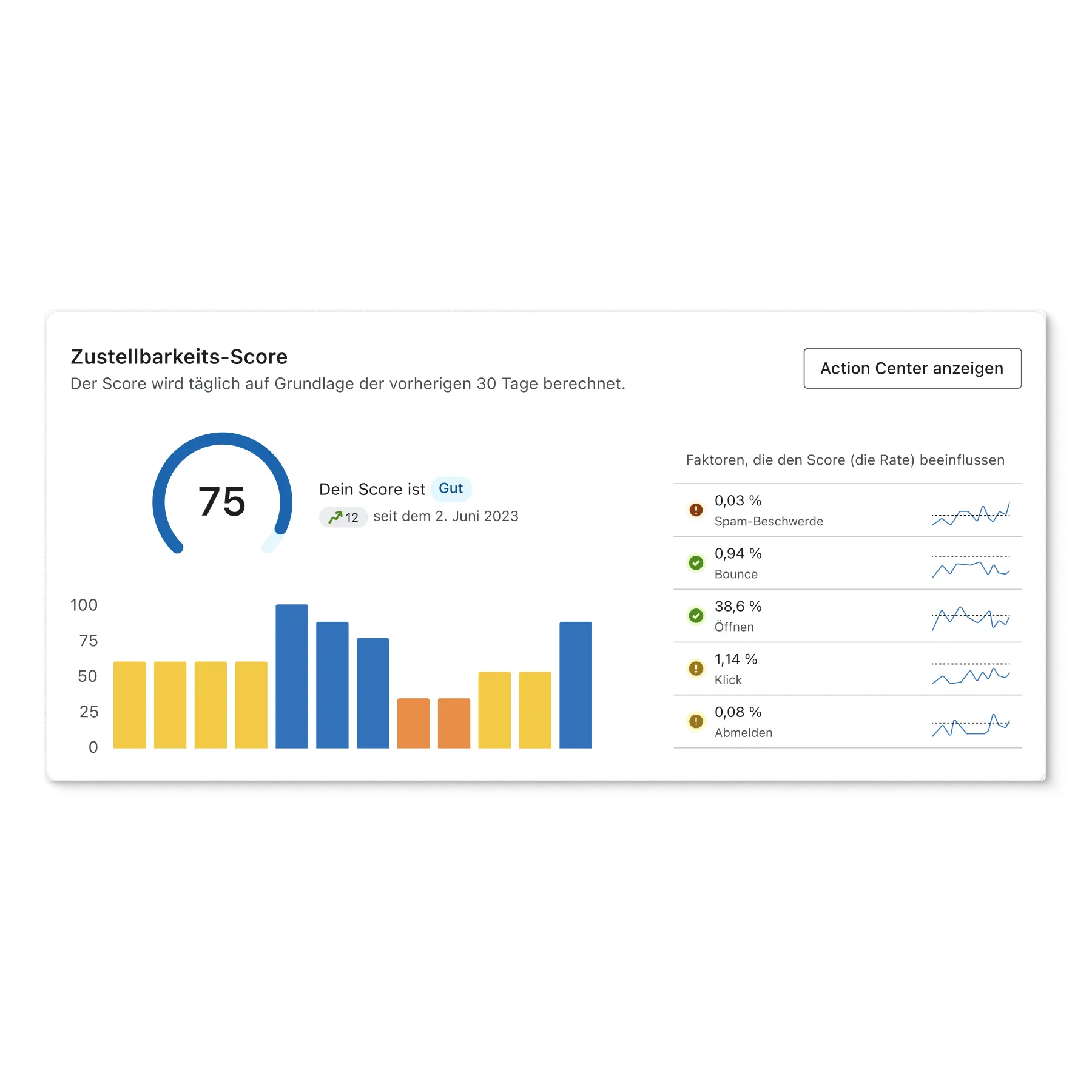 Je weiter du im Warming-Prozess voranschreitest und mehr Nachrichten sendest, desto besser sollte dein Zustellbarkeits-Score ausfallen. Sieh dir die Faktoren an, aus denen sich dein Zustellbarkeits-Score zusammensetzt, und vergleiche sie mit den Benchmarks.