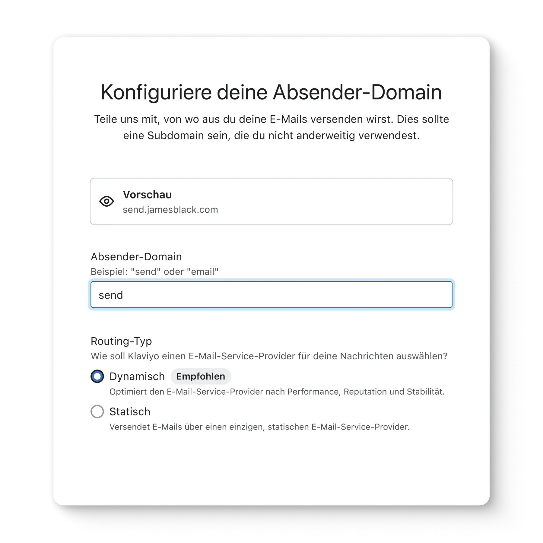 Klaviyo wird diese Absender-Domain für den Versand all deiner E-Mails nutzen. Im Laufe der Zeit stärkt dies deine Absenderreputation.