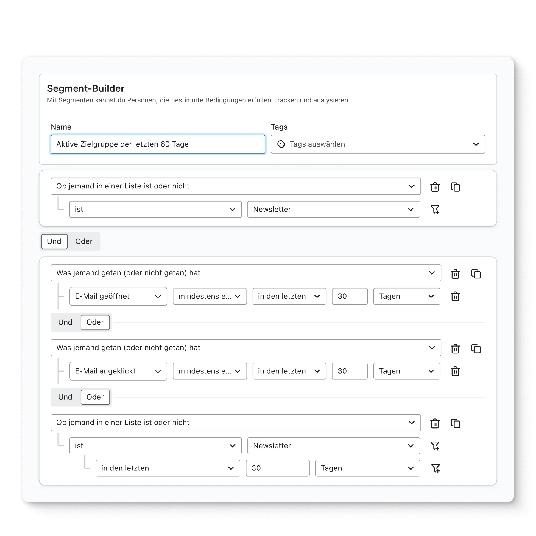 Wenn du von einem anderen ESP zu Klaviyo wechselst, solltest du das vorkonfigurierte 30 Tage lang aktive Segment in deinem Konto anpassen. Es sollte Profile einschließen, die in den vergangenen 30 Tagen mit E-Mails von deiner vorherigen Plattform interagiert haben.