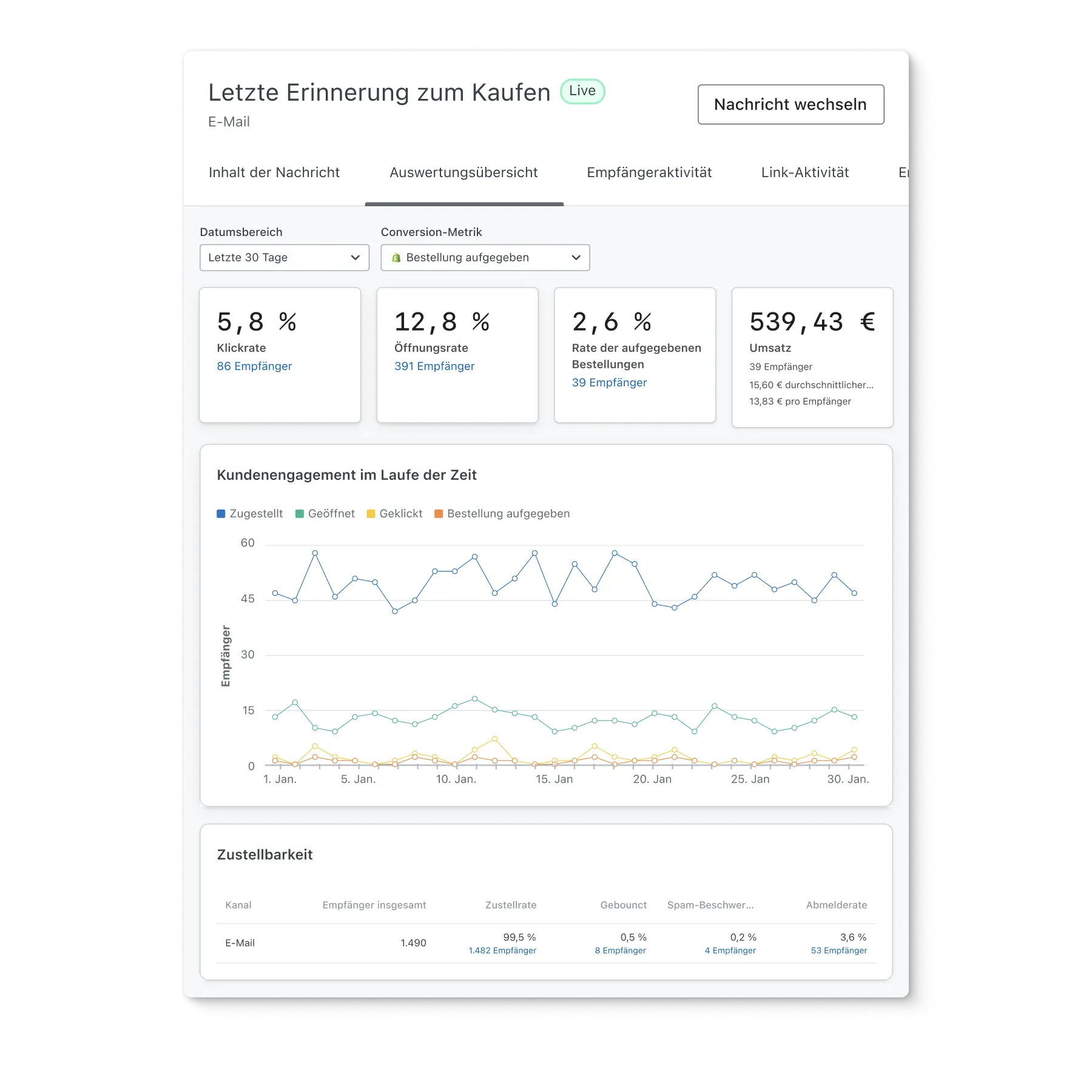 Die Öffnungsrate, Klickrate, Abmelderate, Spam-Beschwerderate und Bounce-Rate haben Einfluss darauf, ob deine Nachrichten im Posteingang zugestellt werden. Während du dein Sendevolumen mit Klaviyo steigerst, kannst du mithilfe unserer Reporting-Tools kontrollieren, ob du auf Kurs bist.