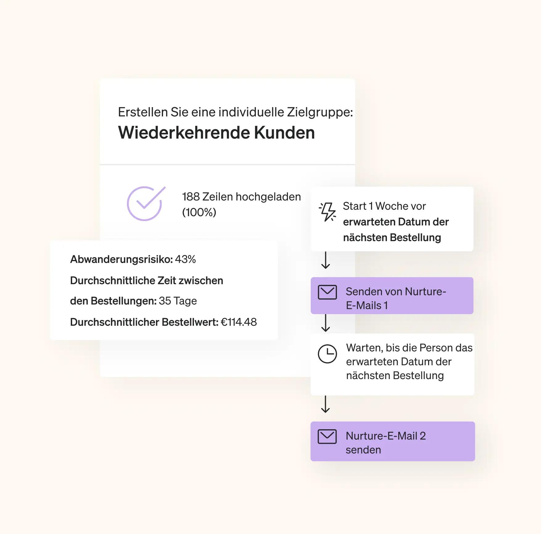 Mit Auslöser-Flows, die auf Daten, Ereignissen, dem Benutzerverhalten und weiteren Aspekten basieren, erreichst du eine gezielte Personalisierung. Daran anschließend kannst du Segmente, Filter, A/B-Tests und mehr für das Targeting und die Optimierung nutzen.