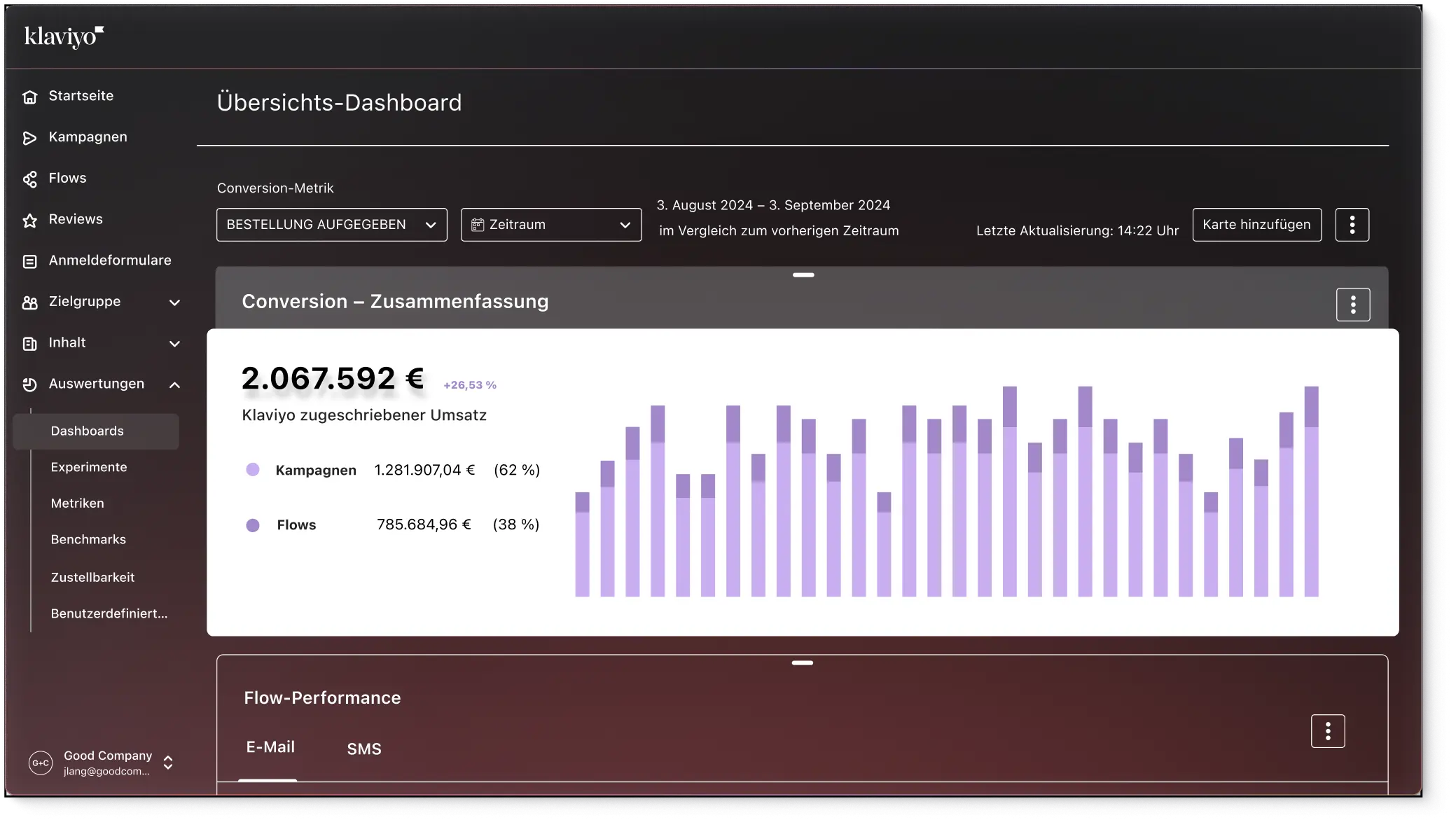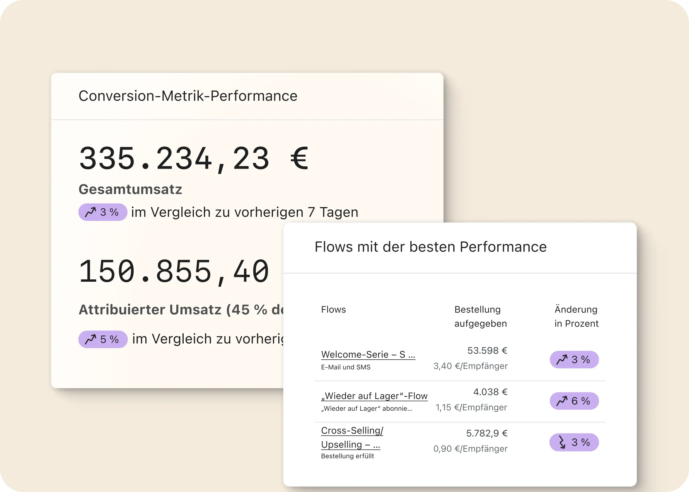 Richte anpassbare Dashboards ein, um Umsätze und Kampagnenergebnisse zu überwachen. Sorge mit Kontrollen und Warnungen für eine zuverlässige Zustellung und verfolge, welche Produkte und Nachrichten wiederholte Käufe fördern.