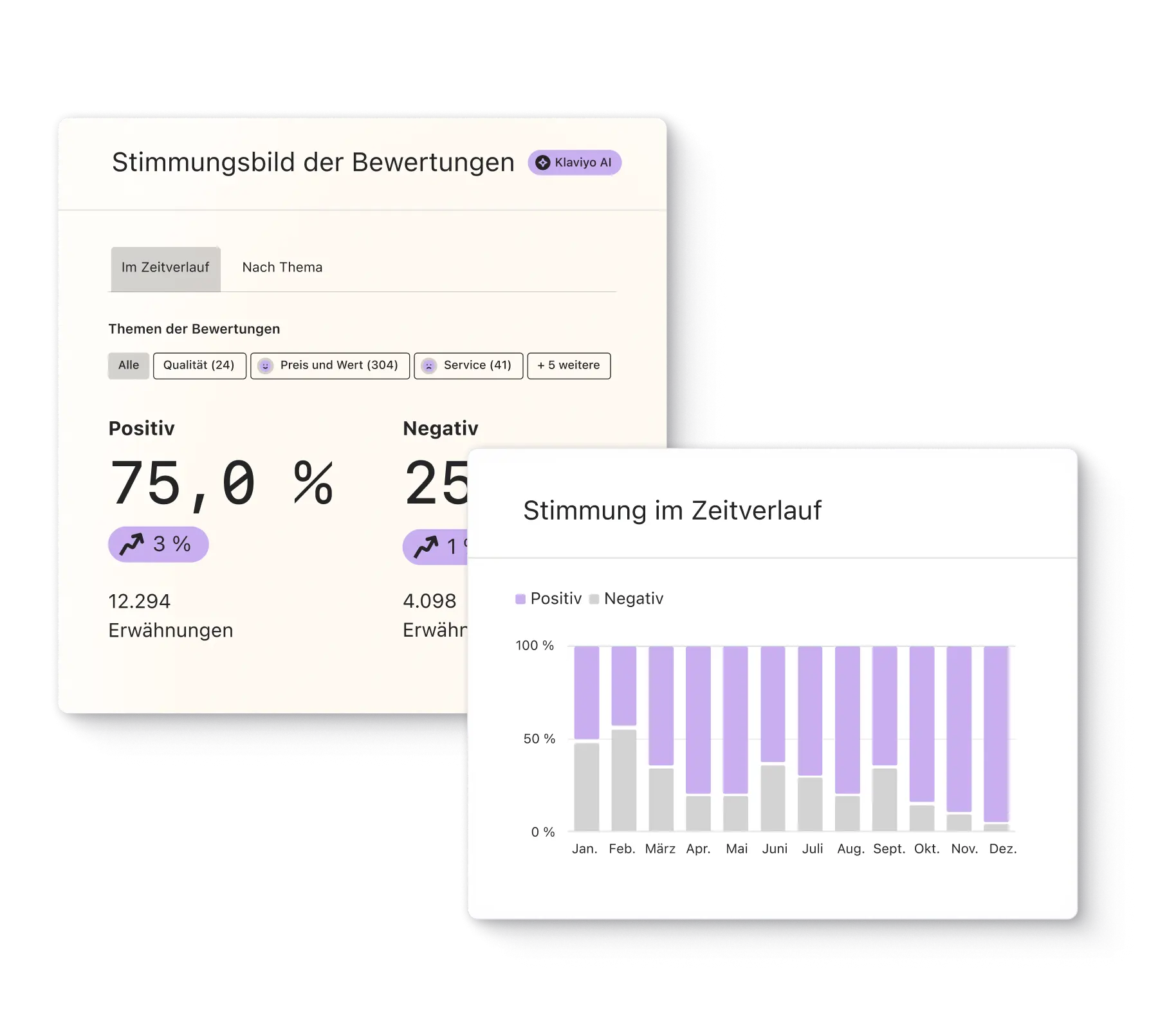 Berichte zu Akquisition und Kundenbindung ermöglichen dir, das Wachstum zu verfolgen. Mithilfe von Review Sentiment AI erhältst du ein Stimmungsbild von Kund*innen in Bewertungen. Und die Advanced KDP zeigt dir Muster beim Kaufverhalten auf.