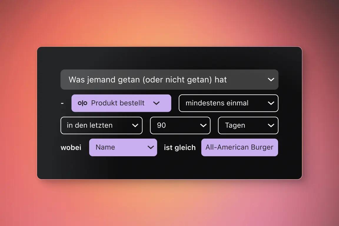 Du möchtest Käufer*innen einer bestimmten Produktkategorie finden, die in der letzten Saison einen Rabattcode verwendet haben und im Vereinigten Königreich wohnen? Verwende beliebig viele Bedingungen, um besonders zielgerichtete Segmente zu erstellen.