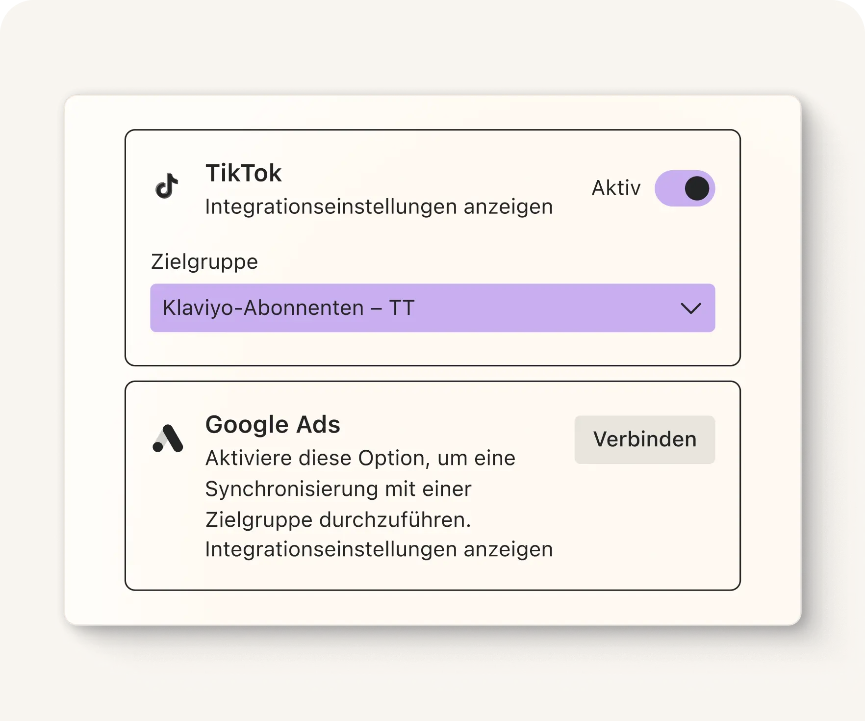 Meta (Instagram, Facebook), Google Ads, Pinterest, TikTok und Criteo. Hier findest du unsere vollständige Liste der Integrationen.