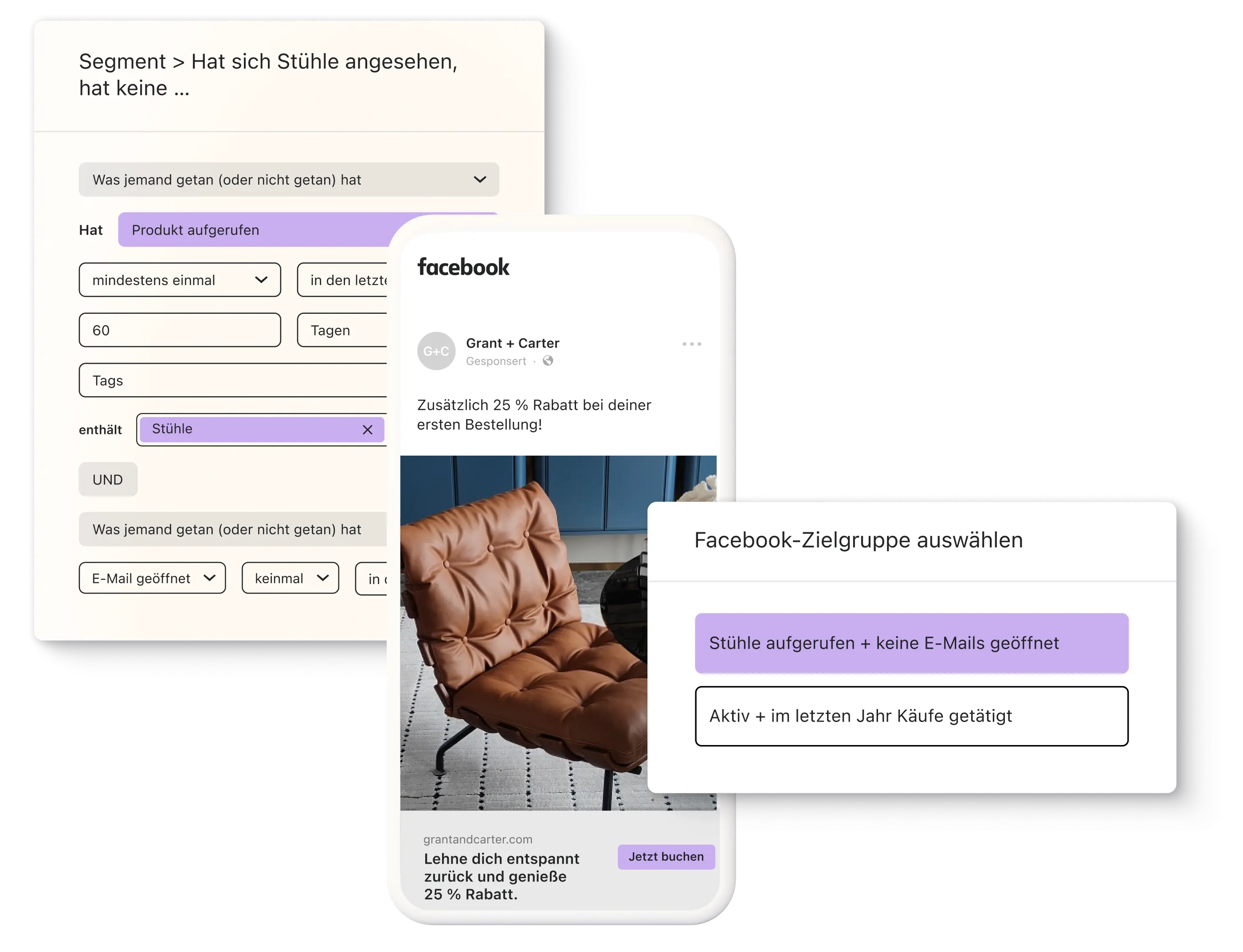 Sprich aktuelle Interessent*innen erneut an, verringere Warenkorbabbrüche und betreibe effektives Cross-Selling – mit Anzeigen, die durchgehend mit deinem Messaging übereinstimmen.