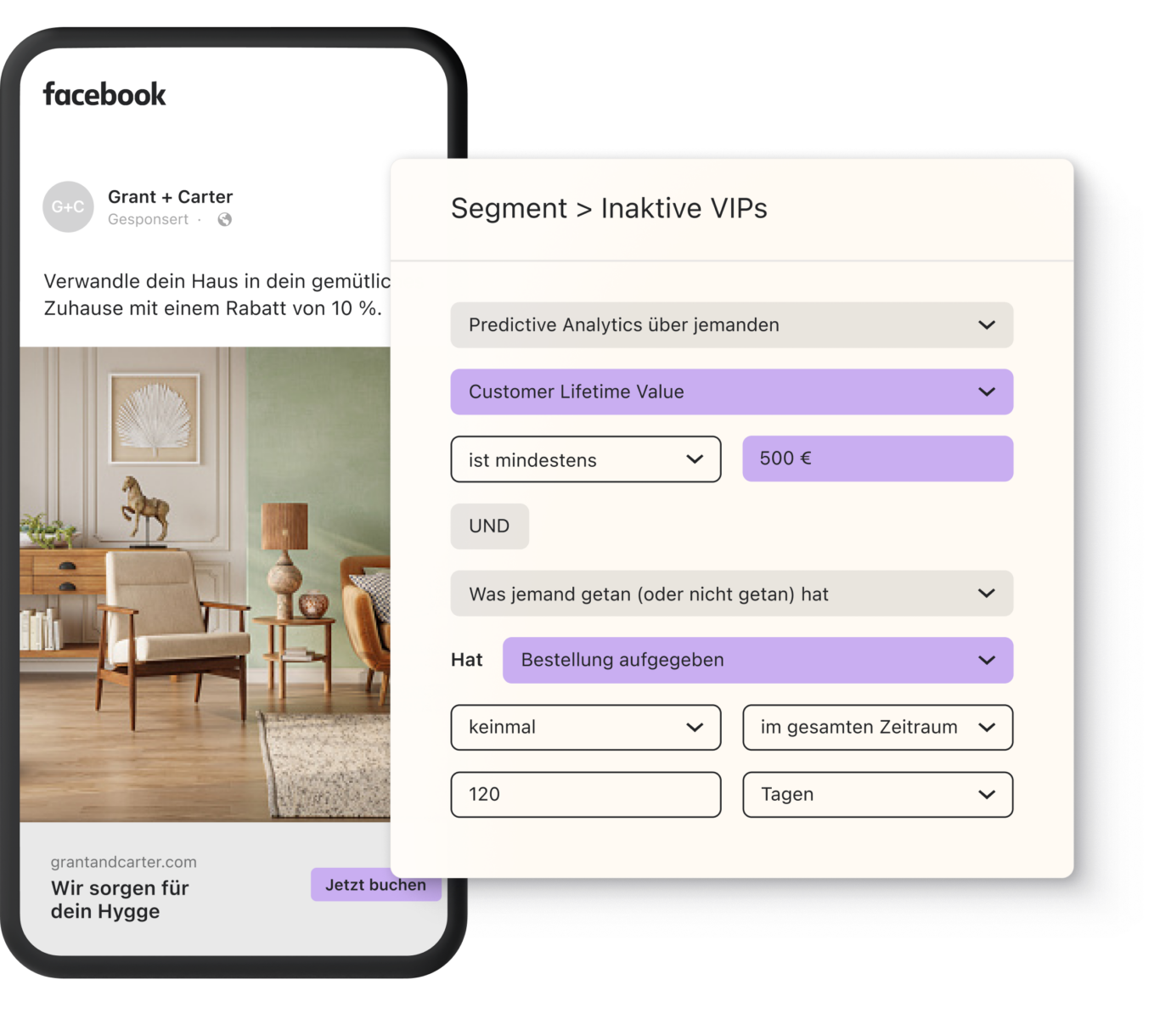 Mit personalisierten, an die jeweiligen Präferenzen angepassten Anzeigen kannst du aktuelle Interessent*innen erneut ansprechen [EN], inaktive Kund*innen zurückgewinnen und Warenkorbabbrüche reaktivieren.