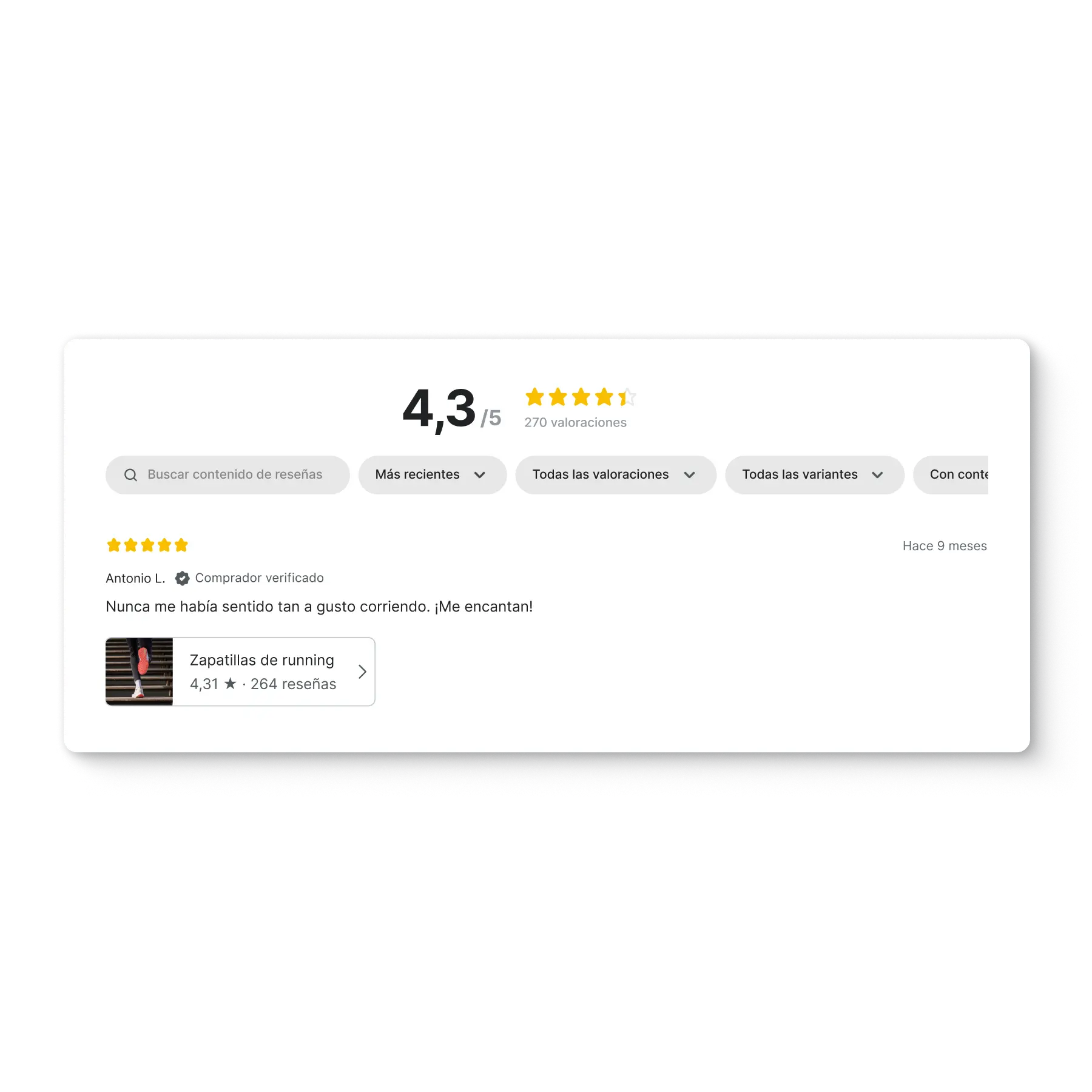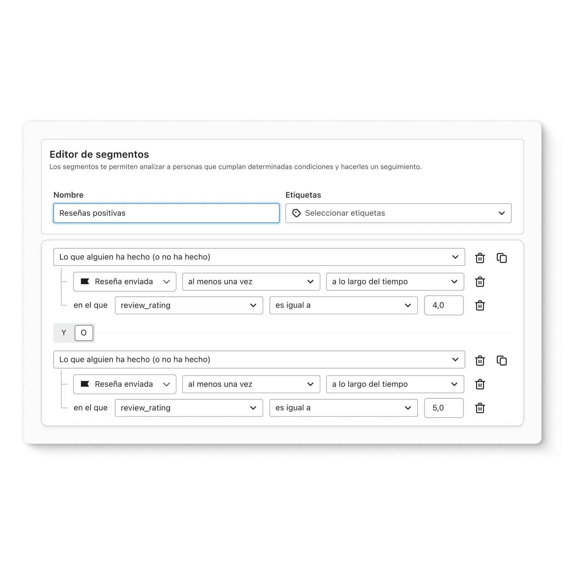 Klaviyo Reviews permite la segmentación por valoración y por comentarios recopilados mediante preguntas personalizadas en las reseñas. Si utilizas una herramienta diferente para recopilar las reseñas de los clientes, asegúrate de que los datos se sincronicen con Klaviyo para que puedas usarlos en la segmentación.