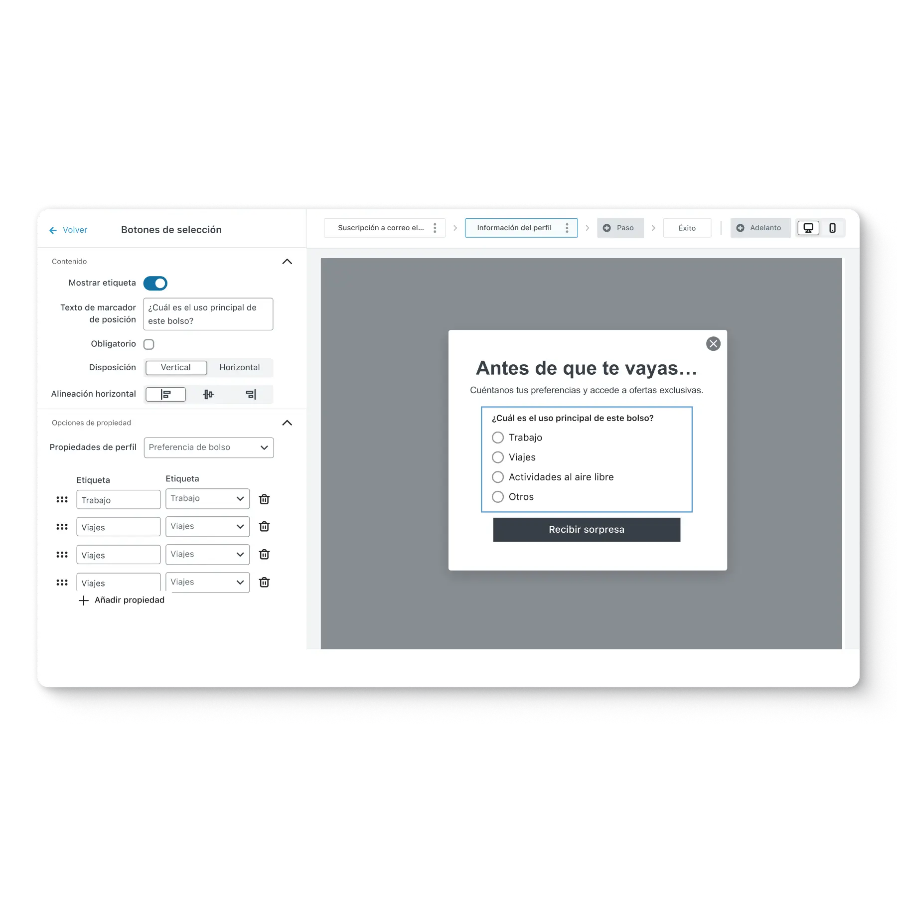 Identifica lo que te gustaría saber de tus clientes en función de tu negocio, como la fecha de su boda, el tipo de mascota o el tipo de piel que tienen, y añade un campo a tu formulario de registro para preguntarlo. Utiliza formularios adicionales, como un formulario flyout de varios pasos, para obtener más información sobre tus suscriptores tras el registro.