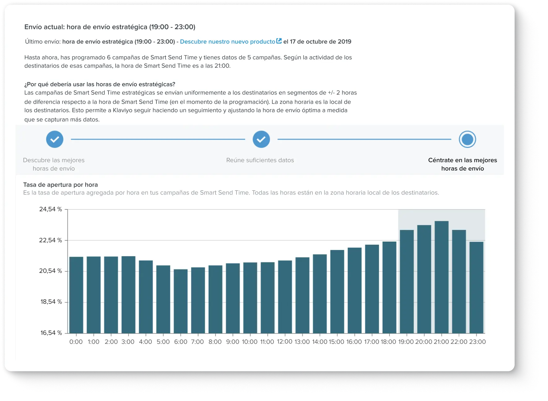 Si llevas a cabo una prueba de Smart Send Time, descubrirás qué hora de envío genera la mejor interacción con tu audiencia para aumentar el rendimiento de tus campañas.