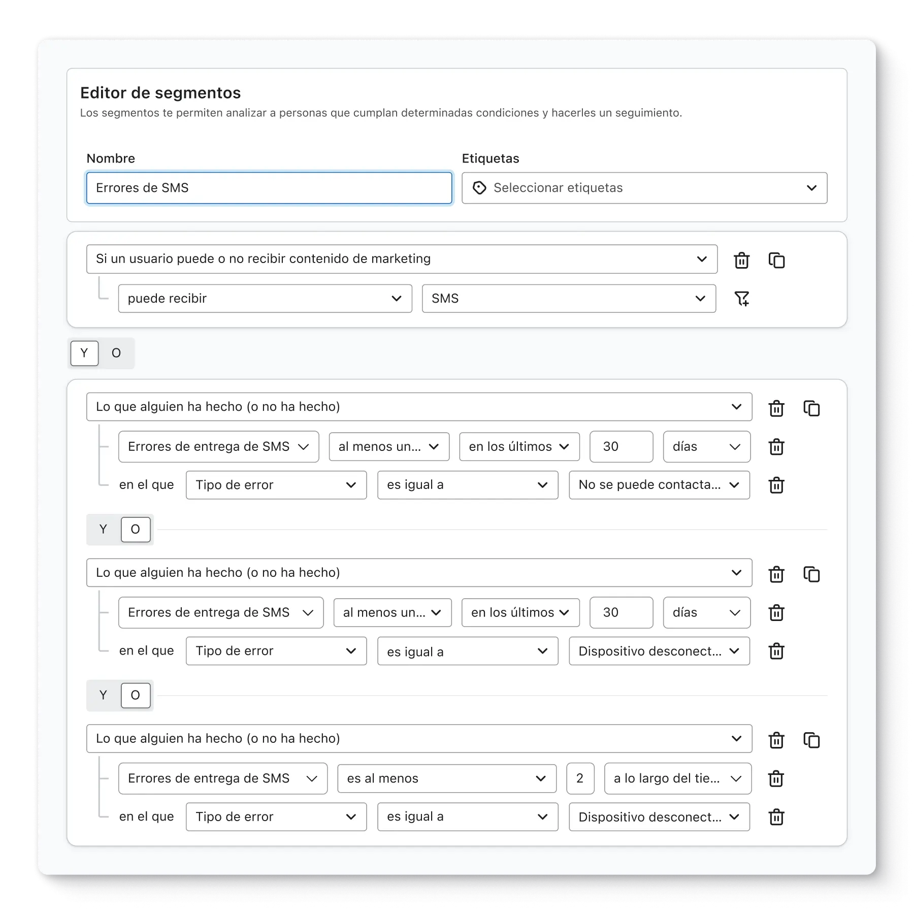 Evita desperdiciar créditos de SMS enviando mensajes de texto a números con errores recientes temporales. Crea un segmento para excluir estos números de la recepción de mensajes.