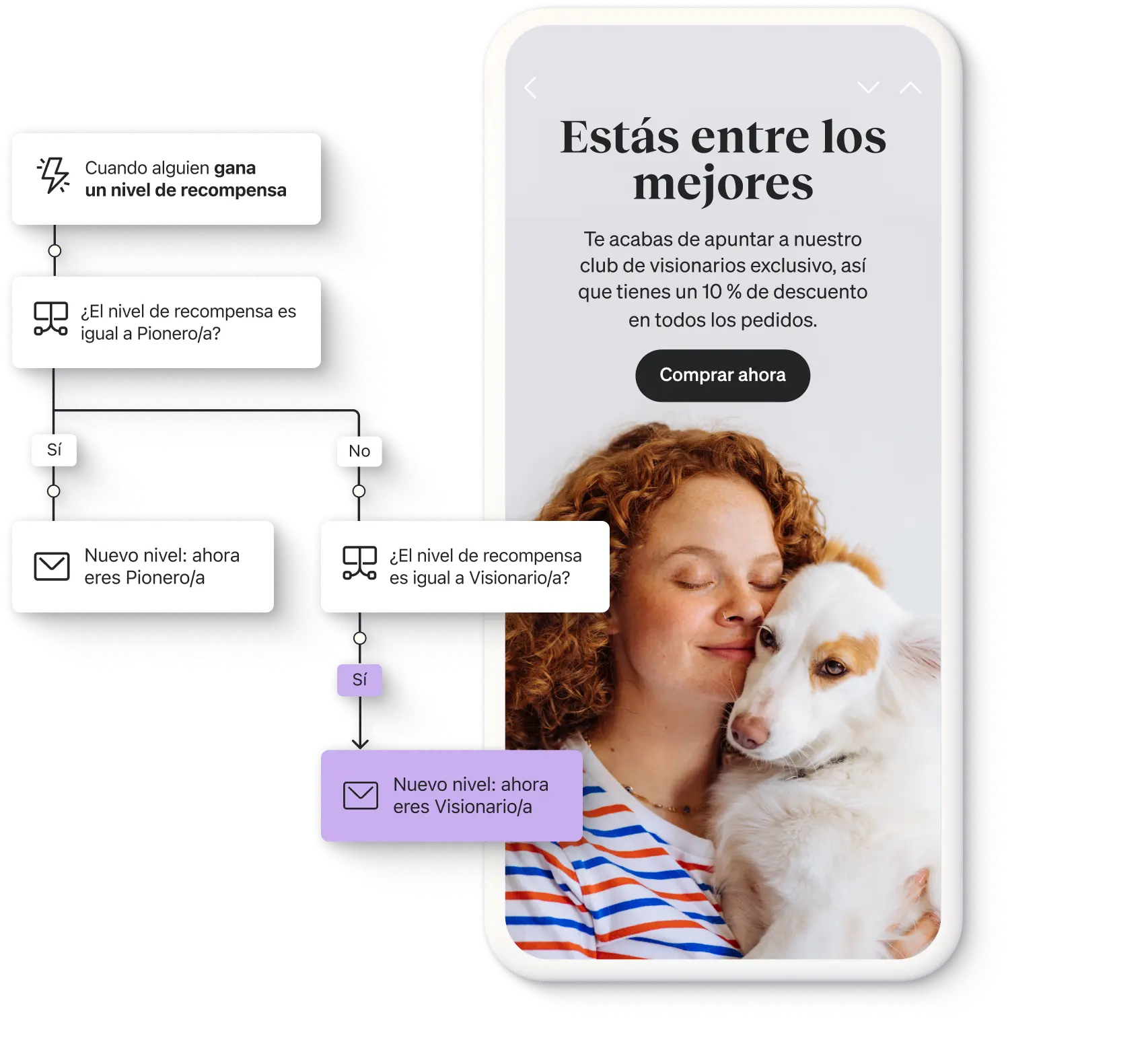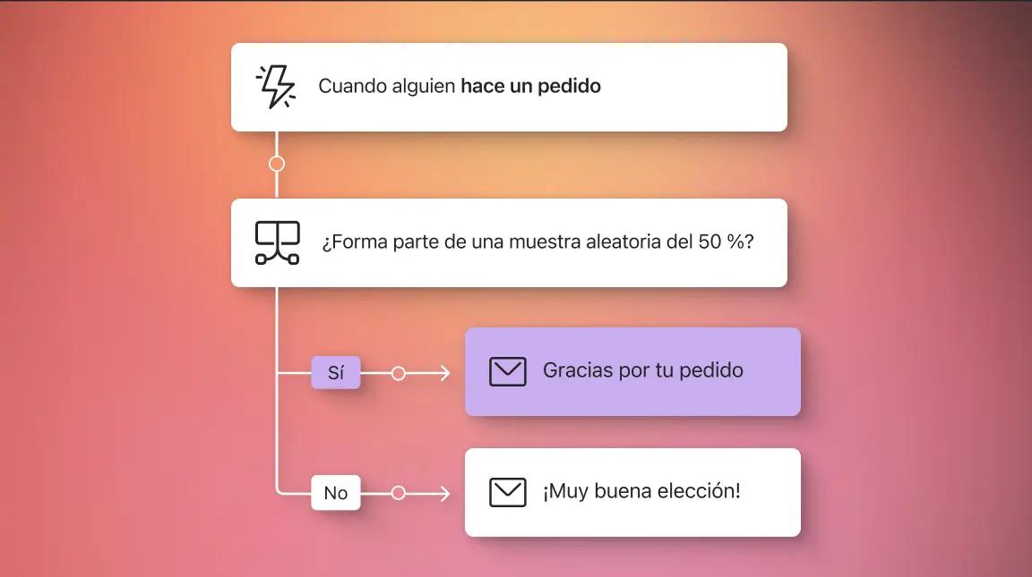 Crea flujos personalizados que activen las experiencias oportunas en respuesta a las acciones, los eventos o los hitos que elijas de los suscriptores. Luego, podrás crear condiciones de ramificación (la «lógica de división») para generar recorridos del cliente más pertinentes.