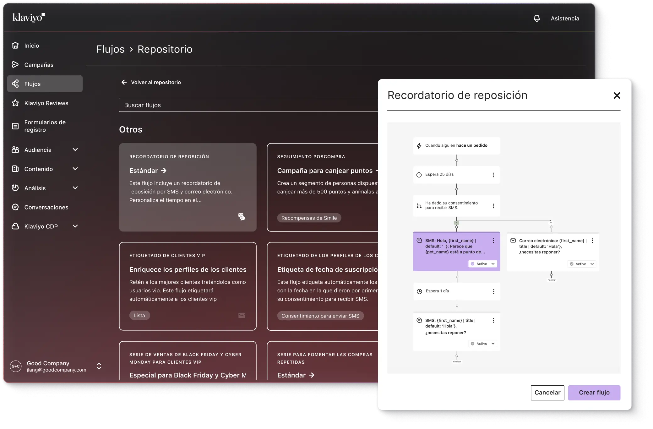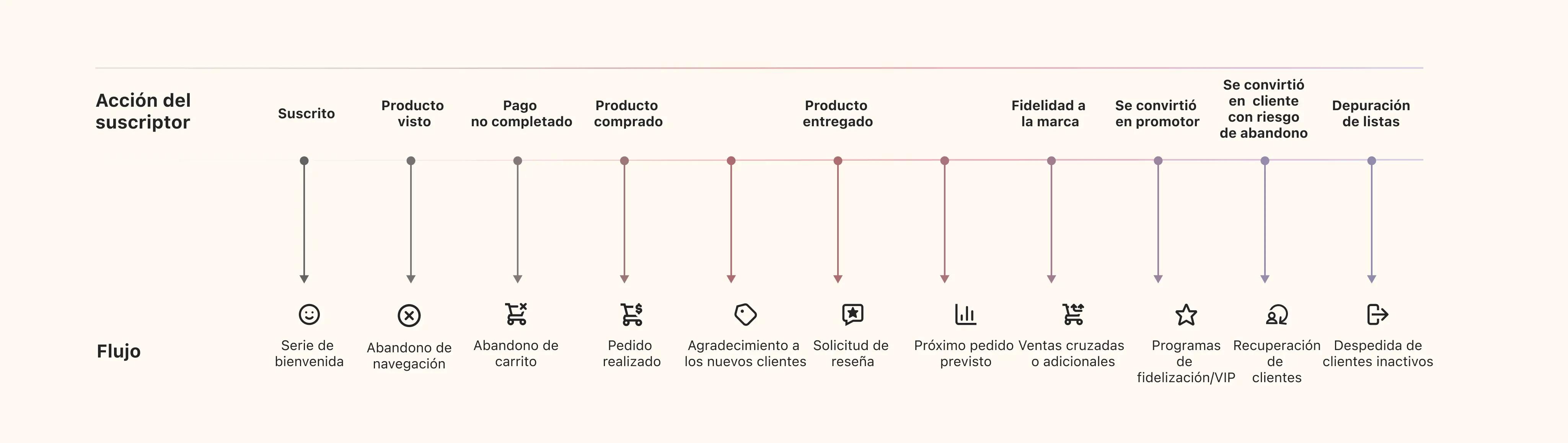 En Klaviyo, un flujo automatizado es una función que activa una acción o experiencia específicas en respuesta a un comportamiento, hito, evento o dato de un suscriptor en particular. En otras herramientas de marketing, los flujos automatizados se denominan «automatizaciones» o «campañas por goteo».