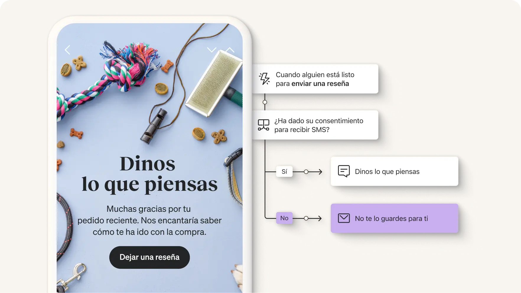 Pregunta automáticamente a los clientes qué piensan de la experiencia de compra. Recomiéndales otros productos que les puedan interesar y comprueba si dejan una reseña positiva.