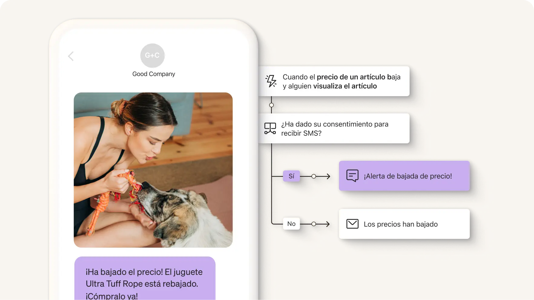 Crea experiencias multicanal con correos electrónicos, SMS y notificaciones push en un solo flujo.