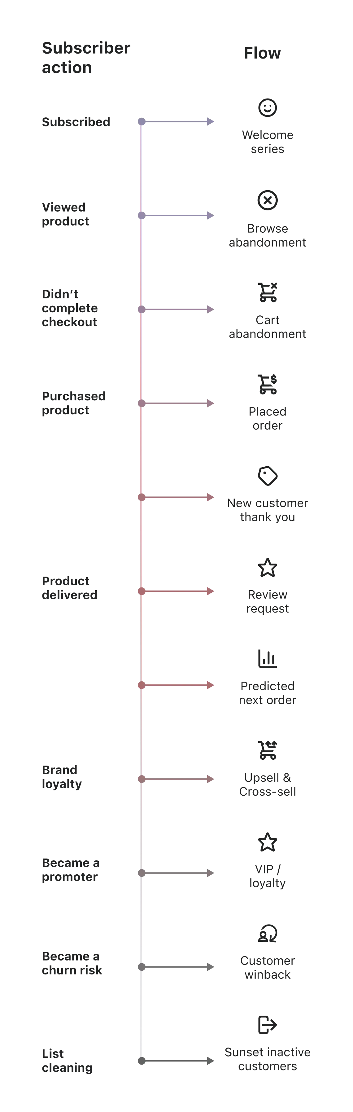 En Klaviyo, un flujo automatizado es una función que activa una acción o experiencia específicas en respuesta a un comportamiento, hito, evento o dato de un suscriptor en particular. En otras herramientas de marketing, los flujos automatizados se denominan «automatizaciones» o «campañas por goteo».