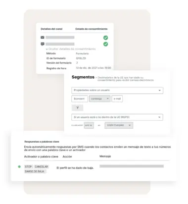 Mantén actualizados los perfiles de los clientes fácilmente a medida que crecen tus listas de contactos, y recoge el consentimiento para enviar correos electrónicos y SMS.