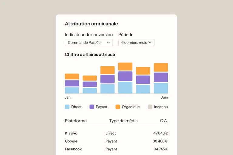 Découvrez l’attribution omnicanale de Klaviyo. Mesurez le ROI de chaque canal—email, SMS, réseaux sociaux, publicités—et optimisez vos revenus.