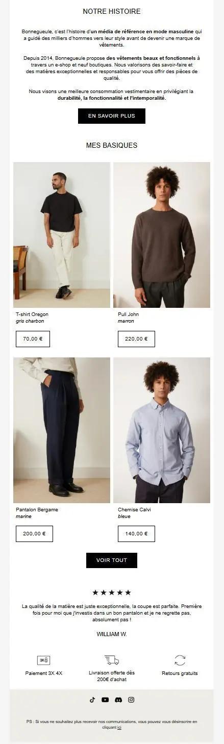 - Une présentation sobre et élégante : La cohérence graphique est parfaitement maîtrisée entre les deux e-mails, dans le respect de l’univers BonneGueule (ton neutre, typographie minimaliste, visuels épurés).