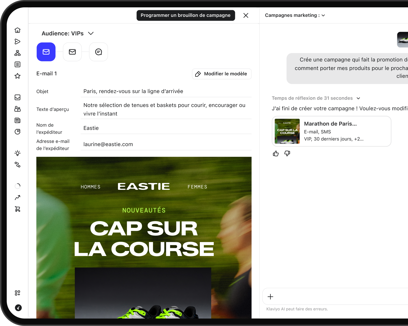 Fort des 14 ans d’expertise de Klaviyo et de l’analyse de milliards d’interactions de consommateurs, Composer crée des campagnes complètes, parfaitement fidèles à votre image de marque, à votre audience et aux spécificités de chaque canal.