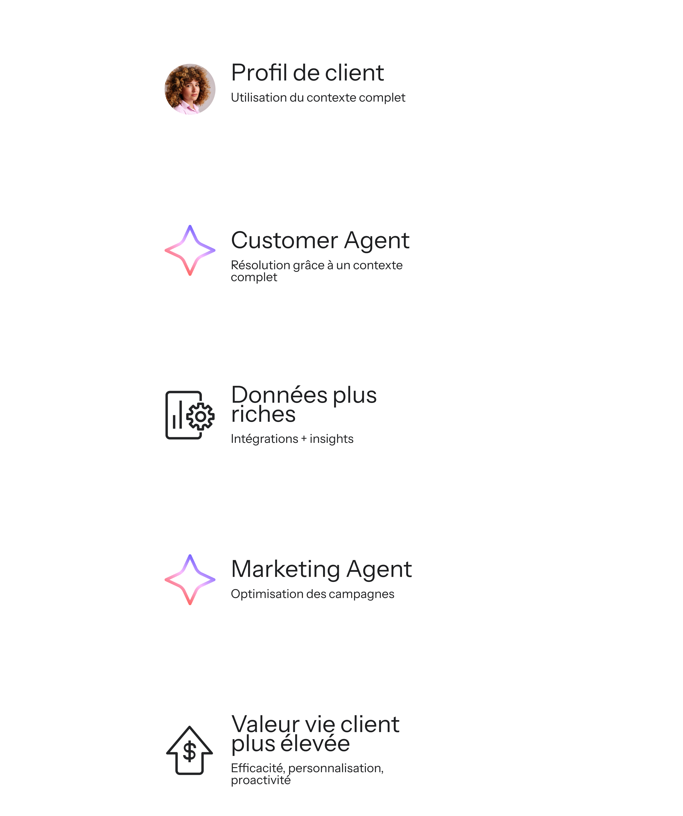 Avec le Customer Agent, chaque interaction est plus efficace, personnalisée et pertinente, parce que votre agent dispose d’une vue complète du client, et pas seulement d’une simple conversation.