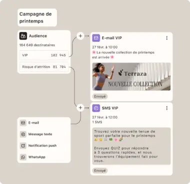 Bientôt disponible Outil de création de campagnes omnicanales : concevez des campagnes multisegments et multimessages pour l’ensemble de vos canaux (e-mail, SMS, notifications push et WhatsApp), à partir d’une seule interface.
