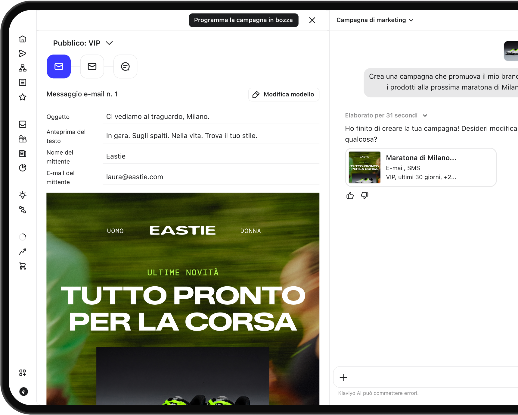 Descrivi il tuo obiettivo. Approva il lavoro. Avvia direttamente su Klaviyo. Scopri il vibe marketing.