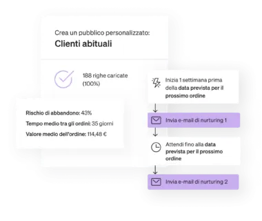 Utilizza moduli e-mail del marchio mirati per far crescere il tuo elenco marketing. Dopodiché, coinvolgi i clienti tramite più canali e sfrutta le previsioni per anticipare il churn (tasso di abbandono) o targetizzare i clienti ad alto valore.