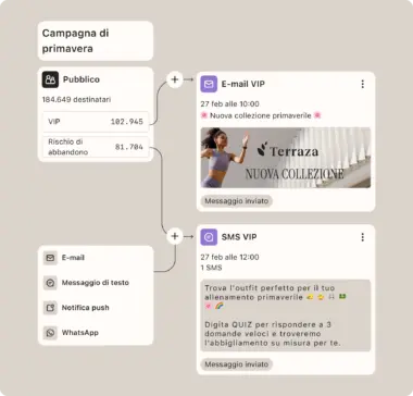 Crea facilmente campagne a più passaggi tramite e-mail, SMS, notifiche push e WhatsApp.