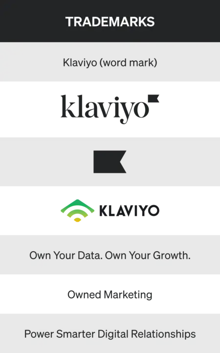 Following is a list of Klaviyo, Inc. trademarks and registered trademarks in the U.S. and other countries. This list is updated from time to time. Failure by Klaviyo to list a particular trademark (registered or unregistered) is not a waiver of any Klaviyo rights.