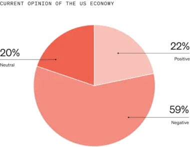 Overall, opinion of the current US economy is relatively split: While 59% of consumers feel negatively about the economy, 42% feel neutral or positive, and 46% believe it’s holding steady or on its way up.