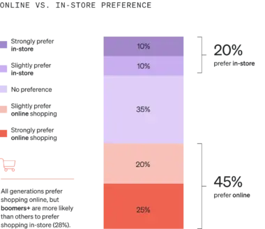 Consumers are 2.25x more likely to prefer shopping online, but they’re currently shopping about equally online and in-store. Those who shop in-store do so to touch the product and for immediate product availability, while those who shop online do so mostly out of convenience. Nearly half of consumers prefer email over all other methods of brand marketing.