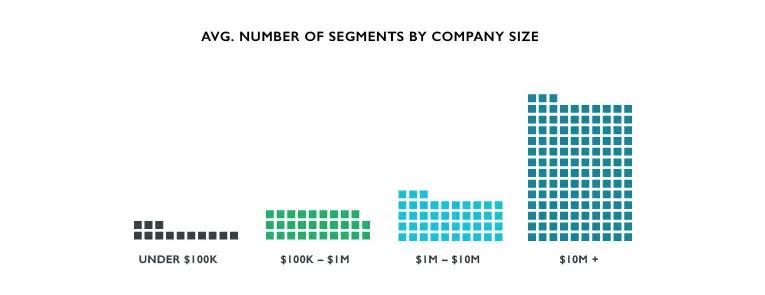On average, we found that companies with an annual revenue of under $100K in 2016 had 13.36 segments. Those with annual revenue of $100K to $1M had 29.96; companies with $1M to $10M had 43.96. Meanwhile, companies with more than $10M in 2016 annual revenue had an average of 133.97 segments.