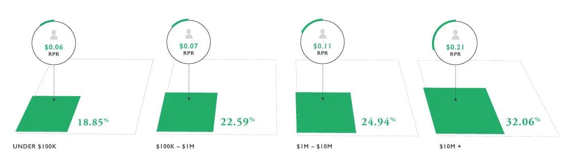To look at the impact of email marketing on revenue in Q4, we divided the ecommerce companies up by 2016 annual store revenue. We found that the companies with greater annual revenue have a greater percentage of their revenue coming from email — and that’s not all. They also make more revenue for each email they send, with higher revenue per recipient.