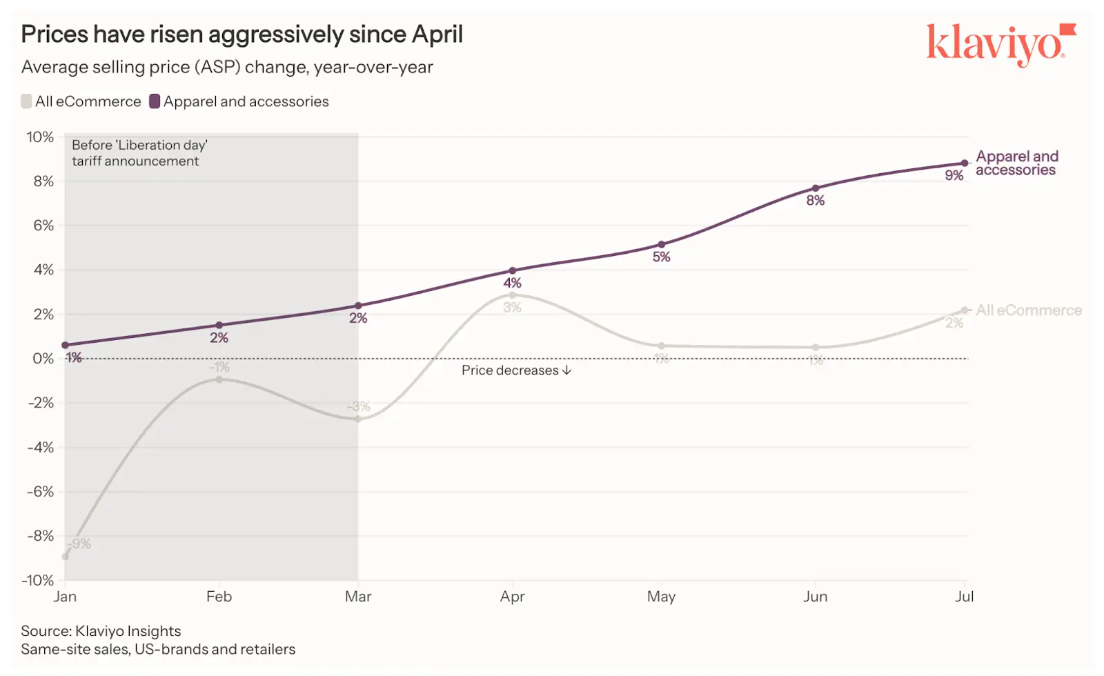 After a dip in Q1, average selling prices (ASP) began climbing in April and have risen every month since. Apparel and accessories saw the sharpest increase at 9% as tariff uncertainty squeezed retailer margins, prompting them to pass more costs to consumers.