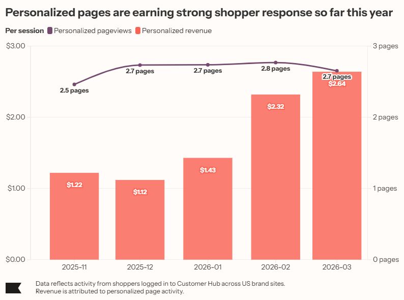 Revenue per session from personalized experiences more than doubled between December 2025 and March 2026 — rising from $1.12 to $2.64.