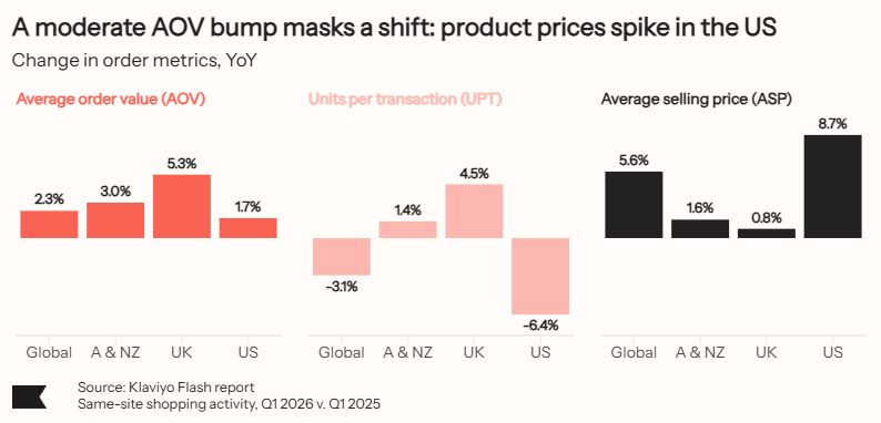 Average order value rose just 1.7% in the US, but that number conceals two forces pulling in opposite directions: product prices up 8.7%, units per transaction down 6.4%. Shoppers are spending more but taking less home — a pattern consistent across the US, UK, Australia, and New Zealand. Product views per ordered product also climbed across verticals, a sign that the path to purchase is getting longer.